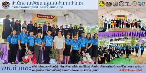 สำนักงานพัฒนาชุมชนอำเภอท่าแซะ โดย นางสาววาสนา เกตุวารี พัฒนาการอำเภอท่าแซะ มอบหมายให้ นางสาวอาริยาพร สีหะเนิน นักวิชาการพัฒนาชุมชนชำนาญการ เข้าร่วมโครงการเรียนรู้สู่อาชีพ สร้างรายได้จากภูมิปัญญาท้องถิ่น เพื่อการเรียนรู้ตลอดชีวิต Learn to Earn เพื่อส่งเสริมให้ผู้เรียนพัฒนาทักษะกระบวนการคิด วิเคราะห์ แก้ปัญหา และการเรียนรู้จากการปฏิบัติจริง ผ่านกิจกรรมบูรณาการภูมิปัญญาท้องถิ่นกับองค์ความรู้สมัยใหม่ อันจะนำไปสู่การสร้างอาชีพและรายได้อย่างยั่งยืนและส่งเสริมให้ผู้เรียนตระหนักถึงคุณค่าของการเรียนรู้ สามารถพัฒนาตนเองอย่างต่อเนื่อง โดยใช้ความรู้และทักษะจากโครงการเป็นฐานในการต่อยอดสู้อาชีพหรือสร้างรายได้ในอนาคต สอดคล้องกับแนวคิด Learn to Earn