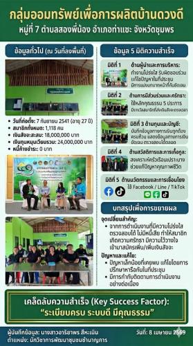 พช.ท่าแซะ ขอประชาสัมพันธ์ กลุ่มออมทรัพย์เพื่อการผลิตบ้านดวงดี หมู่ที่ 7 ตำบลสองพี่น้อง อำเภอท่าแซะ จังหวัดชุมพร